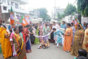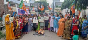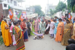 बदायूं :- बिहार के दरभंगा जिले में राहुल गांधी के मंच से पीएम मोदी और उनकी मां को मोहम्मद रिजवी उर्फ राजा ने भद्दी गाली दी है। इस मामले को लेकर भाजपा महिला मोर्चा बदायूं द्वारा कांग्रेस जिलाध्यक्ष अजीत यादव के कैम्प कार्यालय/आवास नेकपुर पर जोरदार धरना प्रदर्शन करके राहुल गाँधी का पुतला फूंका।