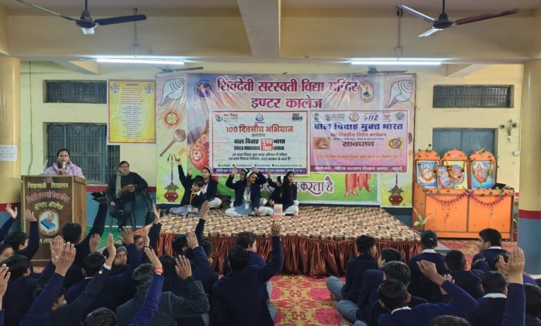 बदायूं। भारत सरकार द्वारा संचालित 100 दिवसीय विशेष कार्यक्रम बाल विवाह मुक्त भारत के अंतर्गत जिला प्रोबेशन अधिकारी महोदय के निर्देशानुसार महिला कल्याण विभाग के द्वारा शिव देवी सरस्वती विद्या मंदिर इंटर कॉलेज, बदायूं में बाल विवाह मुक्त भारत के 1000दिवसीय विशेष जागरूकता कार्यक्रम का आयोजन किया गया। बाल विवाह एक गैर कानूनी कार्य है इसी कारण सरकार ने बाल विवाह प्रतिषेध अधिनियम_ 2006 का प्रावधान किया है जिसमें बाल विवाह करने एवं कराने वाले सभी लोगों के लिए सजा का प्रावधान किया गया है । जिला मिशन कॉर्डिनेटर छवि वैश्य द्वारा बताया गया है कि विवाह की आयु लड़की की आयु 18 वर्ष एवं लड़के का 21 वर्ष होना चाहिए। जनमानस को बताया गया कि अगर आपके आसपास लड़के या लड़की का बाल विवाह हो रहा तो आप 1098 ,1090 ,181,112 पर कॉल करके जानकारी दे सकते है जिसमे जानकरी प्रदान करने वालो की जानकारी गोपनीय रखी जायेगी किन्तु सूचना सही होनी चाहिए । चाइल्ड हेल्पलाइन से केस वर्कर पुरुषोत्तम शर्मा द्वारा लोगों को जागरूक किया गया कि आपके एक छोटे से प्रयास से किसी बालिका का भविष्य अंधकारमय होने से बच जाएगा । साथ ही साथ काशी समाज शिक्षा विकास संस्थान से प्रोग्राम मैनेजर गंगा सिंह एवं काउंसलर चेतना वार्ष्णेय के द्वारा उपस्थित स्टाफ एवं बच्चों को बाल विवाह मुक्त भारत की शपथ भी दिलाई गई । कार्यक्रम में प्रधानाचार्य वेदरतन शर्मा व अध्यापक श्री कृष्ण हरि शर्मा, श्री विनय चौहान, श्री अखलेश मिश्रा एवं विद्यालय का अन्य समस्त स्टाफ उपस्थित रहा।