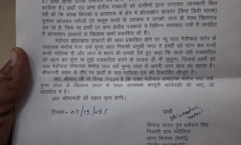 बिनावर थाना क्षेत्र में स्थानीय ग्रामीणों की सूचना पर क्षेत्रीय पत्रकारों ने झोलाछाप डॉक्टरों के खिलाफ खबरें प्रकाशित की थी जिससे क्षुब्ध होकर कस्बा बिनावर न्यू पाल मेडिकल के संचालक मनोज पाल उर्फ मुन्ना ने पत्रकार शिवेंद्र को अभद्र व्यवहार करते हुए धमकी दी एवं जान से मारने की धमकी देते हुए कहा की झोलाछाप डॉक्टरों के खिलाफ अगर कोई खबर प्रकाशित करोगे, तो तुम्हारा अंजाम बहुत बुरा होगा।। इसके बाद पीड़ित पत्रकार शिवेंद्र ने थाना पुलिस को शिकायत प्रार्थना पत्र देने के साथ ही ट्विटर के माध्यम से सीएम योगी, एडीजी जॉन बरेली, मुख्य जिलाधिकारी बदायूं को अवगत कराया और देर शाम वरिष्ठ पुलिस अधीक्षक बदायूं डॉ बृजेश कुमार सिंह से व्यक्तिगत उनके आवास पर मिलकर प्रार्थना पत्र सौंप कर मेडिकल संचालक मनोज पाल के खिलाफ कार्रवाई की मांग की थी जिस पर वरिष्ठ पुलिस अधीक्षक बदायूं ने तत्काल थाना अध्यक्ष बिनावर राजेंद्र सिंह को आवश्यक कार्रवाई हेतु निर्देशित किया था। जिसके बाद भी अब तक थाना पुलिस ने पत्रकार को धमकाने वाले के खिलाफ कोई कार्रवाई नहीं की है, अफसोस की बात तो यह है कि जिलाधिकारी बदायूं व वरिष्ठ पुलिस अधीक्षक बदायूं के आदेश के तीन दिन के बाद भी थाना पुलिस ने अब तक आरोपी मेडिकल संचालक के खिलाफ कोई प्रभावी कार्रवाई नहीं की गई है।