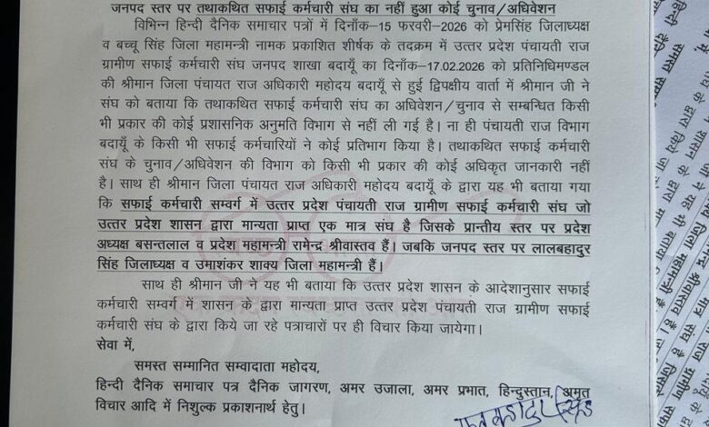 बदायूं। उत्तर प्रदेश पंचायती राज ग्रामीण सफाई कर्मचारी संघ के जिलाध्यक्ष लाल बहादुर सिंह ने बताया कि प्रेमसिंह जिलाध्यक्ष व बच्चू सिंह जिला महामन्त्री उत्तर प्रदेश पंचायती राज ग्रामीण सफाई कर्मचारी संघ जनपद शाखा का 17 फरवरी को प्रतिनिधिमण्डलकी जिला पंचायत राज अधिकारी से हुई द्विपक्षीय वार्ता में डीपीआरओ ने संघ को बताया कि तथाकथित सफाई कर्मचारी संघ का अधिवेशन/ चुनाव से सम्बन्धित किसी भी प्रकार की कोई प्रशासनिक अनुमति विभाग से नहीं ली गई है। ना ही पंचायती राज विभाग के किसी भी सफाई कर्मचारियों ने कोई प्रतिभाग किया है। तथाकथित सफाई कर्मचारी संघ के चुनाव / अधिवेशन की विभाग को किसी भी प्रकार की कोई अधिकृत जानकारी नहीं है। साथ ही जिला पंचायत राज अधिकारी के द्वारा यह भी बताया गया कि सफाई कर्मचारी सम्वर्ग में उत्तर प्रदेश पंचायती राज ग्रामीण सफाई कर्मचारी संघ जो उत्तर प्रदेश शासन द्वारा मान्यता प्राप्त एक मात्र संघ है जिसके प्रान्तीय स्तर पर प्रदेश अध्यक्ष बसन्तलाल व प्रदेश महामन्त्री रामेन्द्र श्रीवास्तव हैं। जबकि जनपद स्तर पर लालबहादुर सिंह जिलाध्यक्ष व उमाशंकर शाक्य जिला महामन्त्री हैं।साथ ही जिला पंचायत अधिकारी ने यह भी बताया कि उत्तर प्रदेश शासन के आदेशानुसार सफाई कर्मचारी सम्वर्ग में शासन के द्वारा मान्यता प्राप्त उत्तर प्रदेश पंचायती राज ग्रामीण सफाई कर्मचारी संघ के द्वारा किये जा रहे पत्राचारों पर ही विचार किया जायेगा।